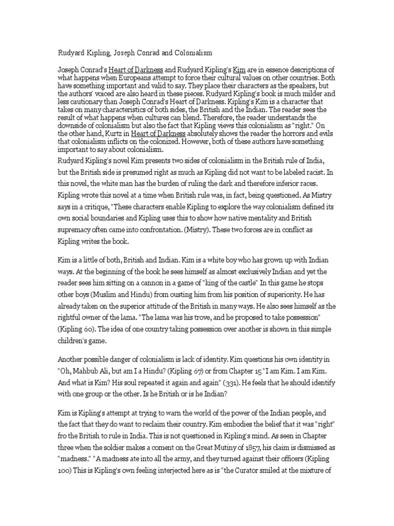 · The Imperialism of Heart of Darkness Heart of Darkness by Joseph Conrad was interesting to me because I like stories like these because it was an exploration gone wrong. The whole story centers round Marlow who was a sailor and was trying to sail up the Congo River in central Africa to meet Kurtz imperialism in heart of darkness and kipling's poetry imperialism sprung from an altruistic and unselfish aim to "take up the white man's burden"1 and “wean [the] ignorant millions from their horrid ways.”2 these two citations are, of course, from kipling’s “white man’s burden” and conrad’s heart of darkness, respectively, and they splendidly Author Joseph Conrad, in his novella Heart of Darkness, addresses this topic of imperialism in a social criticism of the European colonization in Africa. This literary piece was revolutionary during the time period, as it addressed the issue of the rampant racism, mistreatment, and destruction that European colonists brought to the African country Congo